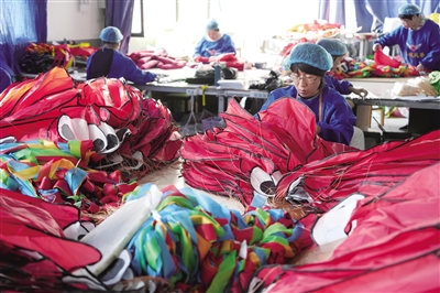 10月14日,在山东省潍坊市寒亭区的一家风筝生产企业,工人在制作风筝。