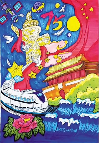 活动中,学校各班级根据各自专业特点,紧密围绕主题,将专业技能与爱国情怀深度融合,开展了多样化的艺术创作活动。美术专业班的学生以“新中国75周年华诞”为主题创作的绘画作品,展现了祖国的壮丽山河和繁荣景象;社会文化艺术专业班的学生通过剪纸这一传统艺术形式,表达了对祖国的深情祝福;计算机专业班的学生设计的创意海报,展现了新时代青年的创新精神;航空、新能源汽车、音乐、舞蹈等专业的学生,精心制作视频,通过动态影像记录了大家对祖国的热爱和对未来的憧憬。图为学生创作的绘画作品。