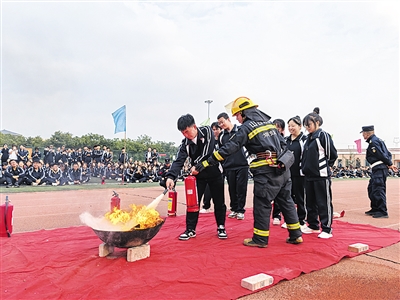 演练结束后,该校组织学生们进行了消防知识培训,讲解了火灾隐患排查、火灾事故预防措施、安全用电等消防安全知识。灭火模拟演练环节,消防员现场演示了干粉灭火器、防毒面具等常用消防器材的使用方法,并指导师生对现场模拟火点进行灭火体验,及时纠正不规范操作。