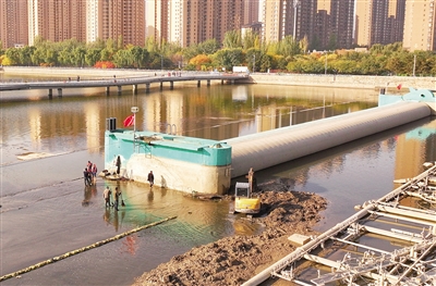 位于迎宾桥和南环桥之间的橡胶拦水坝已超过安全使用年限,为防止发生隐患,昨日,施工方开始对该拦水坝进行更新安装,新坝安装完成后,该片水域将重现水天一色的景观。图为施工现场。 本报记者 张占兵摄