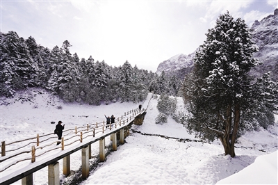 近日,位于甘肃省陇南市宕昌县的官鹅沟森林公园迎来降雪。在皑皑白雪的映衬下,峰谷如梦如幻,美不胜收。