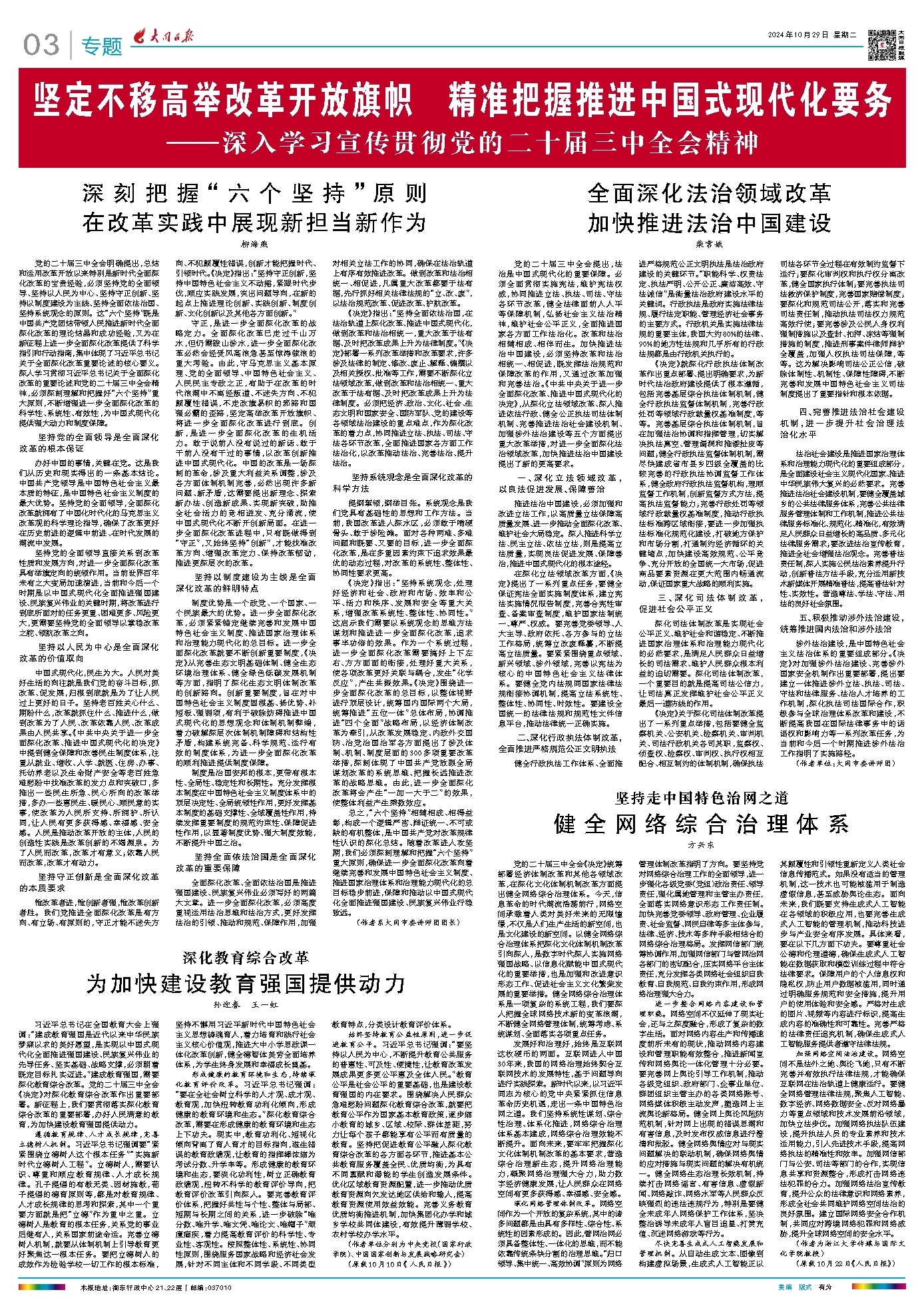 党的二十届三中全会提出,法治是中国式现代化的重要保障。必须全面贯彻实施宪法,维护宪法权威,协同推进立法、执法、司法、守法各环节改革,健全法律面前人人平等保障机制,弘扬社会主义法治精神,维护社会公平正义,全面推进国家各方面工作法治化。改革和法治相辅相成、相伴而生。加快推进法治中国建设,必须坚持改革和法治相统一、相促进,既发挥法治规范和保障改革的作用,又通过改革加强和完善法治。《中共中央关于进一步全面深化改革、推进中国式现代化的决定》,从深化立法领域改革、深入推进依法行政、健全公正执法司法体制机制、完善推进法治社会建设机制、加强涉外法治建设等五个方面提出重大改革举措,对进一步全面深化法治领域改革,加快推进法治中国建设提出了新的更高要求。