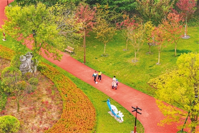 10月27日,市民在山东省荣成市桑干河植物园内一处“口袋公园”游玩(无人机照片)。