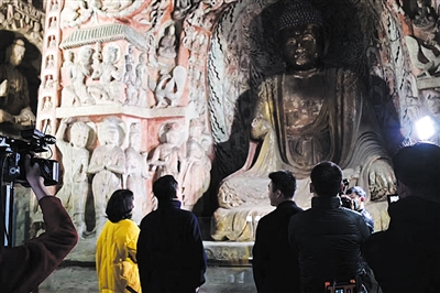 是日上午, 来云冈石窟旅游的各地游客依然很多。选择在这个时候游云冈,少了一份喧嚣,多了几分静美。漫步在石窟之间,仿佛能听到北魏平城的风铃声,感受着云冈石窟的宁静与温暖。当陈宝国、刘芳菲出现在景区时,游客立马围成一圈,向他们报以热烈的掌声。人群中一句幽默的话:“七爷,您从大宅门来的?”陈宝国向游客投来亲切的微笑。10时30分,直播正式开始,从第20窟起步,刘芳菲与陈宝国以对话的方式向人们介绍云冈石窟历史文化与建筑精髓。在第20窟,刘芳菲说:“2016年12月31日,我第一次来云冈石窟,见到第20窟大佛时的激动情景还历历在目。我知道冬季的云冈石窟特别美,我第一站就要把它的美呈现给观众和网友。”