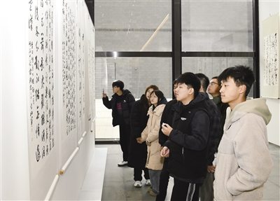 开展前,天津书法家现场题字。现场展出的书法作品有行、草、楷等书体,绘画作品有山水、工笔画等,创作者选材广泛、内容丰富,呈现的作品手法或寓意美好,或鲜活生动,观者在书画呈现的艺术之美中了解天津历史文化,感受当地群众对美好生活的热爱与向往。