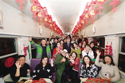 11月25日,旅客在哈尔滨至漠河的K7041次列车上与工作人员合影留念。
