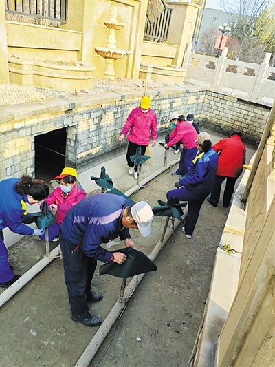 伴随着寒潮来袭,诚博美居物业“暖冬服务”温暖开启。 连日来,诚博美居物业为永和佳园小区楼栋单元门把手、园区健身器材等穿上了“新棉衣”,丝绒的保护套隔绝了金属把手的冰冷,在业主双手触及之处一股暖意油然而生。 季节在变,物业服务的悉心守护不变。诚博美居物业提前部署防寒防冻及管道清淤工作,清洗管道、过滤网、紧固阀门,为设备维护筑起温暖防线;对喷泉水景进行池中水集中排水和清洗,再将喷泉管道中的水全部排空,随后再对喷泉水泵、线路、喷头等设施进行包裹处理,对存在安全隐患的水泵、线路等进行拆卸检查、维护保养,确保喷泉设施安全越冬。