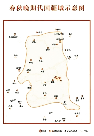 至于第二代国的辖地,我延续黄绍雄的观点。“对照现今行政区划,(周)代国国土包括:今河北省的蔚县、涞源、阳原、怀安、万全、张家口市区及张北的南部、尚义的南部、宣化西部、易县西南部;今山西省的灵丘、广灵、大同县、阳高、天镇及浑源的东部北部、繁峙的东部;今内蒙古的兴和南部、丰镇东面一部。”王城位置亦如同见。