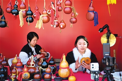 1月8日,传统酒葫芦工艺匠人在西安大唐芙蓉园内的非遗年货集市上直播带货。