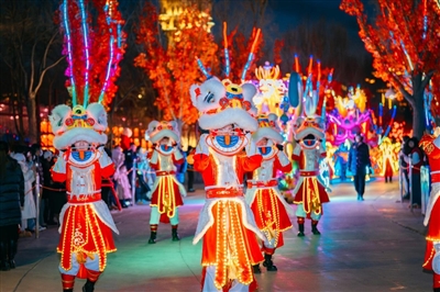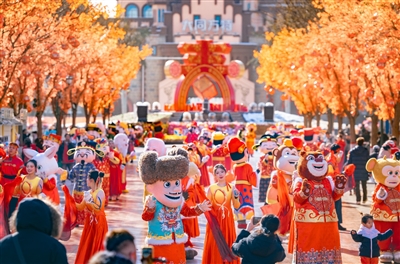 当夜幕降临,整个园区灯光璀璨,宛如仙境。17时,“新春巡游”欢乐起航,绚丽多彩的花车从“欧洲街”出发,演员们身着精致华丽的服饰,载歌载舞,与道路两旁的游客热情互动,他们用灿烂的笑容和优美的舞姿,传递着新春的喜悦与祝福,让游客们沉浸在欢乐的氛围中。巡游结束,梦幻广场的“新春喜乐会”主题晚会热闹启幕,舞台上歌舞、杂技轮番上演,台下游客们在欢声笑语中围着篝火牵手狂欢,共度欢乐团圆年。