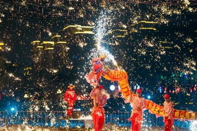 “祈福花火秀”是本次活动的一大亮点,融合了多个非遗演出,让广大游客感受“中国年”的文化底蕴。18时30分,伴随着铿锵有力的鼓声,“落花秀”将整个夜幕点亮,星星之火如雪花般从空中不断飘落,营造了一个浪漫而唯美的氛围。而“火龙钢花”表演则将现场气氛推向了高潮,铁水化作漫天的钢花,如星辰般璀璨耀眼,伴随着飞舞的钢花,一条“火龙”穿梭其中,时而腾飞,时而翻滚。“火壶”表演同样别具一格,表演者手持特制的火壶,以独特的技巧和娴熟的动作,让火焰在壶口和手中舞动,火焰时而如喷泉般冲向天空,时而如游龙般在身边环绕。这种将传统技艺与现代表演形式相结合的方式,既展现了传统文化的魅力,又给广大游客带来了新奇的体验。