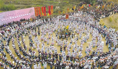 2月5日,在广西融水苗族自治县杆洞乡百鸟衣芦笙坡会上,各族群众一起跳芦笙踩堂舞(无人机照片)。