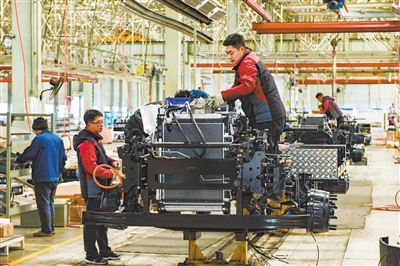 车架预装、走线、车架翻身、安装电控系统、安装电池……2月6日(农历正月初九),陕汽大同专用汽车有限公司生产车间内,已是一派忙碌景象,工人们以饱满的热情投入到新一年的生产任务中。