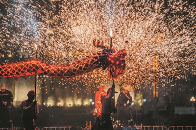与此同时,18点30分上演的“祈福花火秀”无疑是夜间最震撼人心的环节。当火龙钢花与落花秀相互交融,铁火流星漫天飞舞,唯美浪漫至极。期间还有别具一格的火壶演出,表演者舞动着特制火壶,让火焰在壶口和手中舞动,在黑暗中划出一道道绚丽的弧线,为游客们打造了一场视觉盛宴。