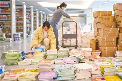 2月10日,江苏省昆山开发区青阳港学校的老师在清点、整理新学期教材。