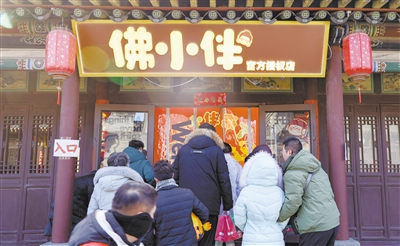 东南邑新开张的佛小伴店内人头攒动,门外排起了长队。来自河北的聂女士和家人满载而归,她高兴地说:“佛小伴在社交媒体上爆火,我们上一次来大同因为时间紧没有买上,孩子们都很遗憾。这次趁着过年探亲,终于买到了心心念念的佛小伴。体验了大同的年味,买上了心仪的产品,这趟大同之旅不虚此行!”