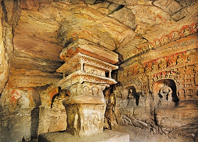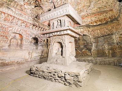 第2窟俗称“寒泉洞”,因其北壁西端常年有细泉流出。窟外壁明窗上方及西侧题刻“山水有清音”、“云深处”。洞窟内三级方形浮屠塔居中,塔面上刻出瓦筒、檐椽、斗拱等仿木建筑构件,层层瓦垄出檐,上层四角镂空雕刻八角棱柱,形成了周匝回廊,为研究北魏建筑提供了实物依据。
