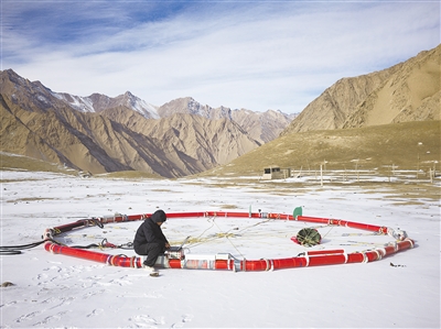 一月十一日,科研人员在新疆和田地区测试航空大地电磁探测系统。
