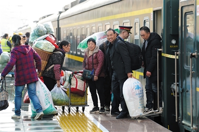 2月17日,在位于陕西汉中市的阳平关站,乘客从6064次列车上下车。