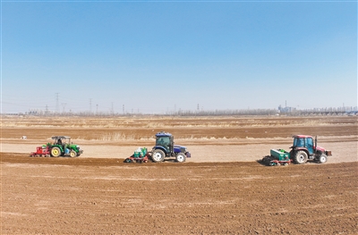 2月18日,在天津市北辰区双口镇,农机在播种春小麦(无人机照片)。