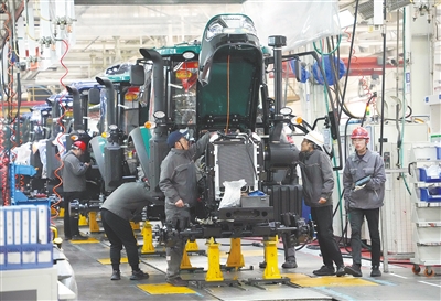 2月19日,工人在位于潍坊市的潍柴雷沃智慧农业科技股份有限公司组装生产农机设备。