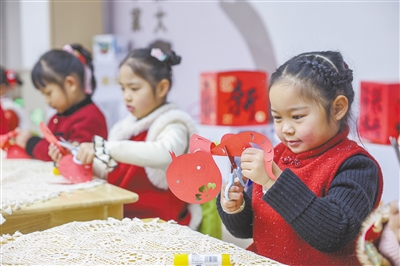 2月20日,孩子们在老师的指导下制作蛇年主题剪纸。