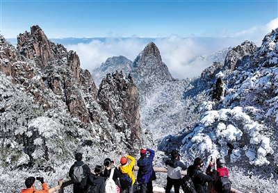 图为2月24日,游客在安徽省黄山风景区欣赏春雪(无人机照片)。