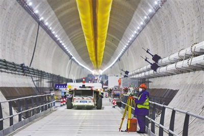 3月4日,中铁十四局建设者在济南市黄岗路穿黄隧道内施工作业。