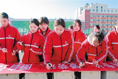 “爱祖国,有梦想。热爱祖国,热爱人民,热爱中国共产党。志存高远,服务人民,奉献社会……”在学生代表樊文波的带领下,全体学生齐声诵读《公约》并进行宣誓,铿锵有力的声音回荡在校园。之后,学生们郑重地在横幅上签下了自己的名字,共同做出承诺:“在今后的学习生活中,一定按照校纪校规严格要求自己,争做一名优秀中职生。”