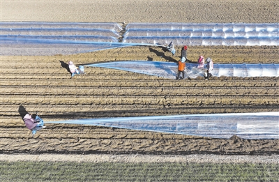 3月11日,丰南区岔河镇四神庄一村的农民在田间为刚播种的马铃薯覆膜(无人机照片)。