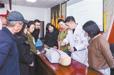 3月17日,平城区党群服务中心携手大同市第五人民医院中心手术部党支部,在平城区白登山街道西坟村社区举办了一场以“春风送暖学雷锋 白衣先锋进社区”为主题的急救培训活动。图为医护人员讲解心肺复苏的操作。 本报记者 韩堃摄