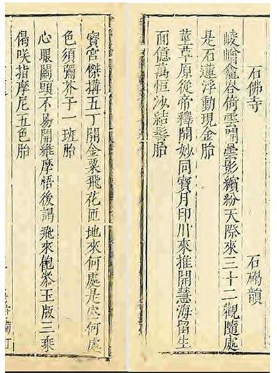 这首诗属七言绝句,韵脚“开”“来”“胎”是平水韵部中的上平十灰,一韵到底。原诗应有120字,在八九十年前辨识的时候就有30余字不可认了,现在可辨字更少。云冈张焯先生考证题目中的后三字应为“和成韵”。诗中缺失的文字我们可以参考其他材料,其一、(清)胡文烨《云中郡志》卷十四《艺文志》有《石佛寺四首》,署名“石碣韵”显然不是人名,而是一种刻在石头上的诗。朱廷翰题诗“和成韵”或为相关的附和作品,我们无法推测两者时间先后。“石碣韵”文字如下: