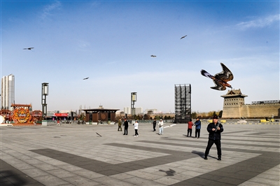 近日,随着气温回暖,春日的气息愈发浓郁,市民纷纷走出家门,来到广场,趁着春风放飞风筝,享受着春日里的惬意时光。记者在永泰门广场看到,湛蓝的天空中点缀着各式各样的风筝,形成了一幅五彩斑斓的画卷。图为市民在永泰门广场放风筝。