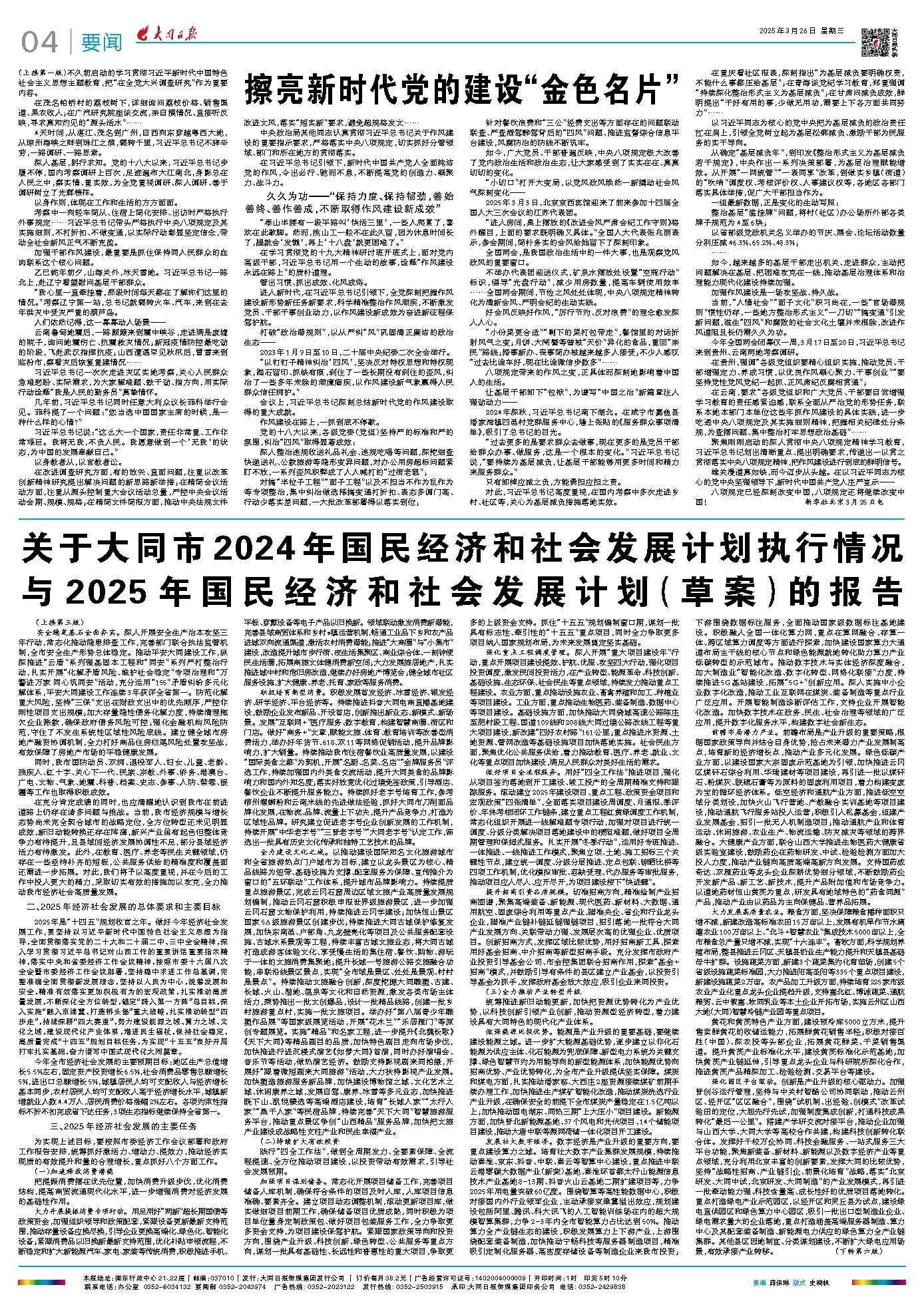 关于大同市2024年国民经济和社会发展计划执行情况与2025年国民经济和社会发展计划(草案)的报告