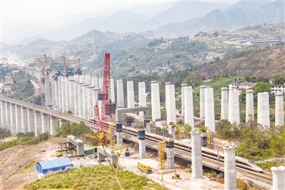 3月27日,郑渝高铁线上一列动车从门式墩钢横梁下通过。