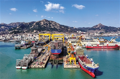 三月三十日,在山东省荣成市石岛管理区修造船产业基地船坞内,工人在建造大型船舶(无人机照片)。