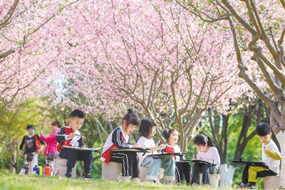 3月31日,浙江省湖州市长兴县雉城街道台基山公园樱花绽放,幼儿园的孩子们用画笔描绘春天美景,感受春日气息。