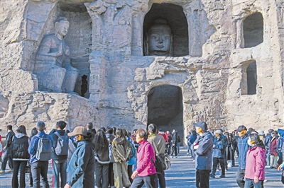3月31日,游客在云冈石窟领略石窟艺术之美,感受大同历史文化的独特魅力。