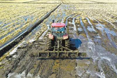 4月7日,在黑龙江北大荒农业股份有限公司友谊分公司第十管理区水稻田中,一台农机在平整土地(无人机照片)。
