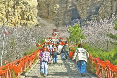 随着气温持续回升,灵丘县龙泉寺景区内漫山遍野的山桃花竞相绽放,如云似霞,吸引了来自河北、内蒙古及省内和大同本地的游客前来踏青赏花。游客们漫步于桃林登山步道,或拍照留念,或席地休憩,感受着“人面桃花相映红”的诗意氛围。图为4月6日,灵丘县龙泉寺景区内游客登山赏花。