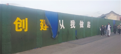 记者看到,这些破损的围挡早已失去原本的美化作用,有的布满大小不一的破洞,破败不堪;有的从中间裂开,裂口在风中晃荡,格外扎眼。不仅如此,围挡上的宣传标语也已残缺不全。