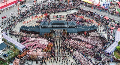 4月12日,当地少数民族群众参加庆祝活动(无人机照片)。