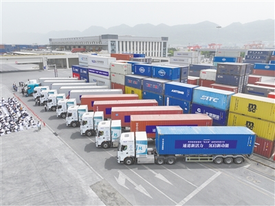 4月14日,氢能重卡在陆海新通道重庆无水港等候发车(无人机照片)。