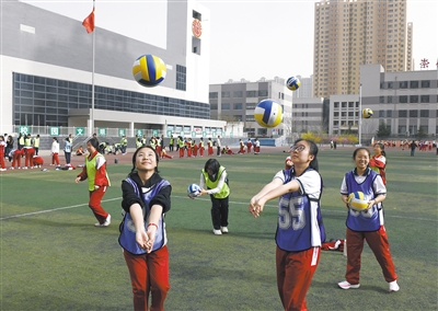 4月16日下午4时20分,记者在大同一中南校操场上看到,体育教师们正在指导初三学生进行体能训练、腿部力量训练,以及立定跳远、前掷实心球等项目的模拟测试。在足球、篮球、排球三大球类训练场地上,学生们正在紧锣密鼓地打磨技巧。场地中央,红白相间的标志杆整齐排列,学生们在教练的哨声中启动,带球穿梭于标志杆之间,身体微倾、步频紧凑,在10秒内顺利到达终点。对于即将到来的中考体育考试,一名正在练习排球垫球的学生信心满满地告诉记者:“45秒内垫球30个以上,满分就没有问题。”中考体育考试她的选报项目是跳绳和排球垫球,在平时的练习中,她都会立一个比中考标准更高的标准,这样才能更加从容地应对中考体育考试,拿到满分。