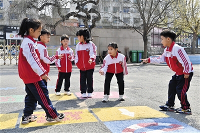 近年来,辽宁省海城市坚持推进教育基础设施建设,通过翻新、修缮、新建等措施持续改善办学条件。图为4月15日,海城市西关小学学生在新建成的校园游戏区内玩跳格子游戏。