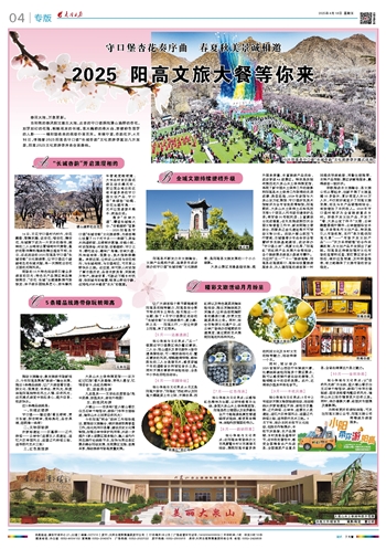 当和煦的春风掠过塞北大地,古老的守口堡拥抱漫山遍野的杏花,如梦如幻的花海、蜿蜒若龙的长城、高大巍峨的烽火台、穿梭粉色雪梦的人影……一幅和谐绝美的画卷扑面而来。幸福守望、杏韵花开,4月16日,伴随着2025阳高县守口堡“长城杏韵”文化旅游季喜迎八方宾朋,阳高2025文化旅游季序曲全面奏响。