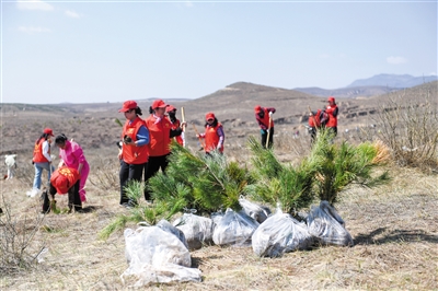 4月19日,大同博恩义工、大同明德社工联合组织150余名志愿者利用业余时间来到新荣区郭家窑乡助马堡村开展公益植树活动,当日共种植油松2000余棵。这些来自社会各界的爱心人士6年来在这里义务种植树苗共计7万余棵,以实际行动让大同天更蓝、地更绿、水更清,用“生态绿”扮靓大同。 本报记者 于宏摄