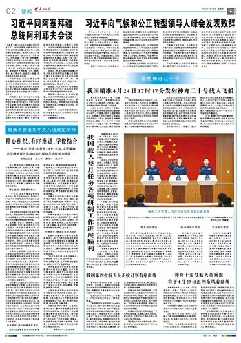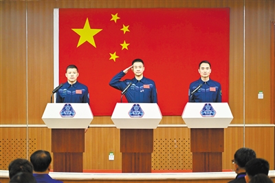 4月23日,神舟二十号载人飞行任务航天员陈冬(中)、陈中瑞(右)、王杰在酒泉卫星发射中心问天阁与媒体记者集体见面。