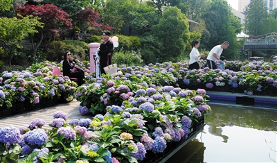 4月28日,2025世界花园大会开幕式在浙江省海宁市举行,本届花园大会以“花园经济 循环往复”为主题,总展示面积50万平方米,包括设计师花园、商家花园、植物品种展等。图为,人们在花园大会绣球展区参观。 新华社记者 翁忻旸摄