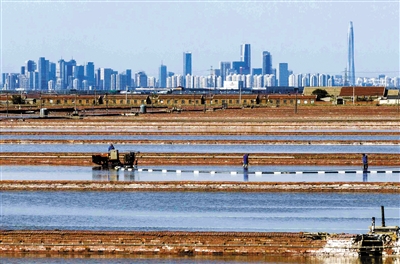 连日来,在天津市滨海新区的天津长芦海晶集团有限公司25万亩盐田里,工人利用晴好天气开展“春扒”作业,百里盐滩一片繁忙。据悉,该集团今年春晒计划产盐50万吨,截至一季度已完成24.8万吨,实现生产“开门红”。图为,4月27日,在天津长芦海晶集团有限公司的盐田,工人操作机械设备进行收盐作业(无人机照片)。